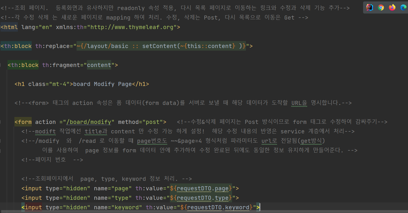<form action “/board/modify/” method =”post” >>>> postmapping 트리거!!!