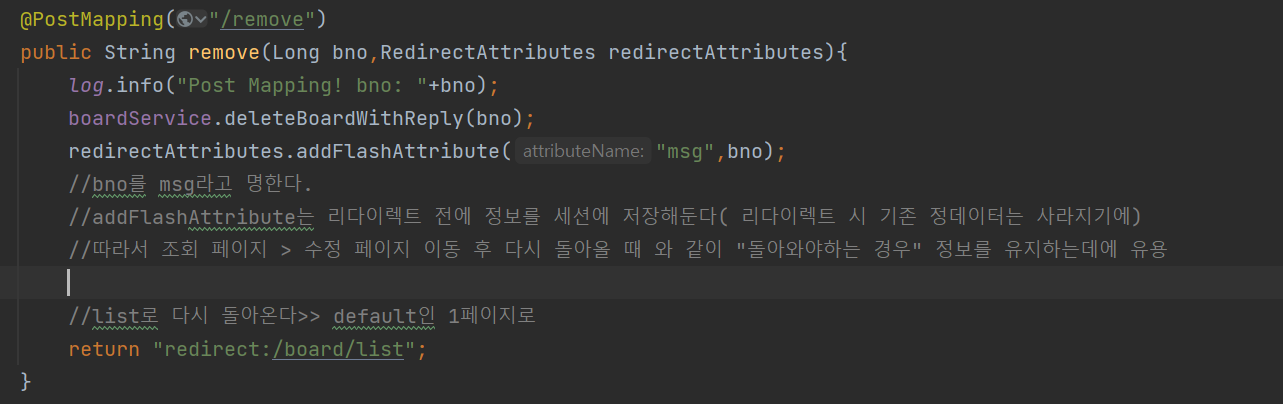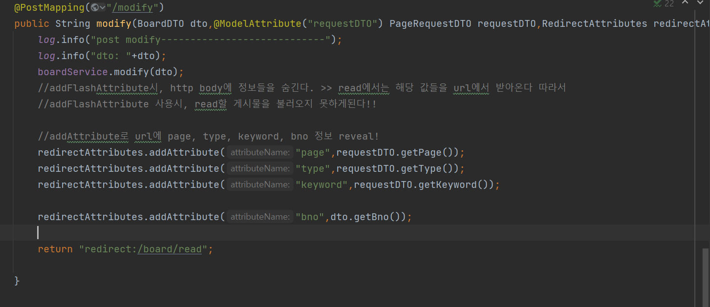 (postMapping의 addFlashAttribute>> url에 노출x, body에 숨긴다. Read.html은 url에서 바로 정보가져오므로 flash를 통한 방식은 불가)