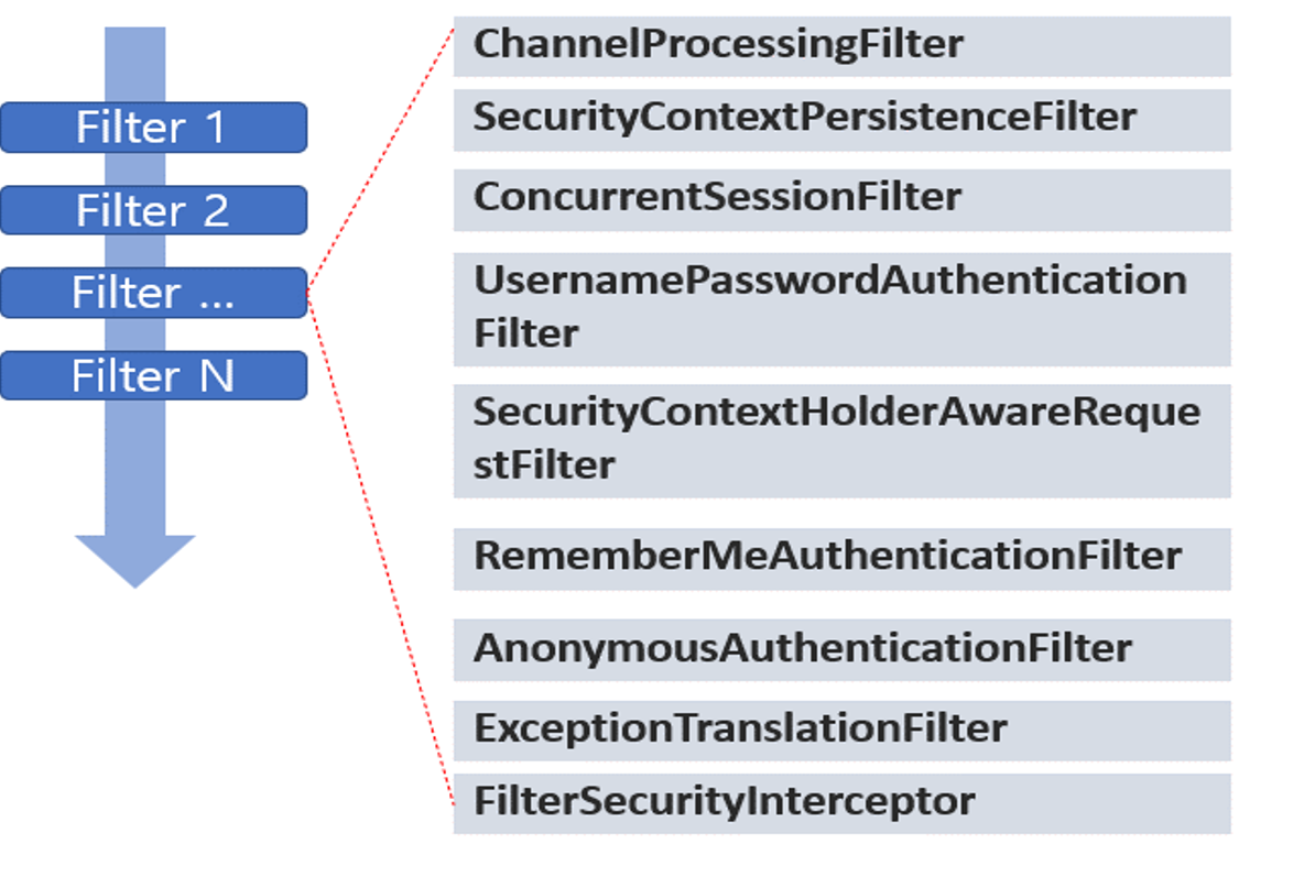 스프링 시큐리티 내에서는 Filter Chain이라는 구조로 Request를 처리한다.