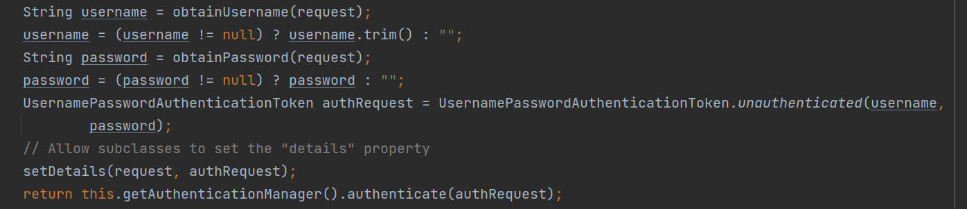 아래는 기본으로 제공되는 필터 중, UsernamePasswordAuthenticationFilter 클래스의 일부이다.
