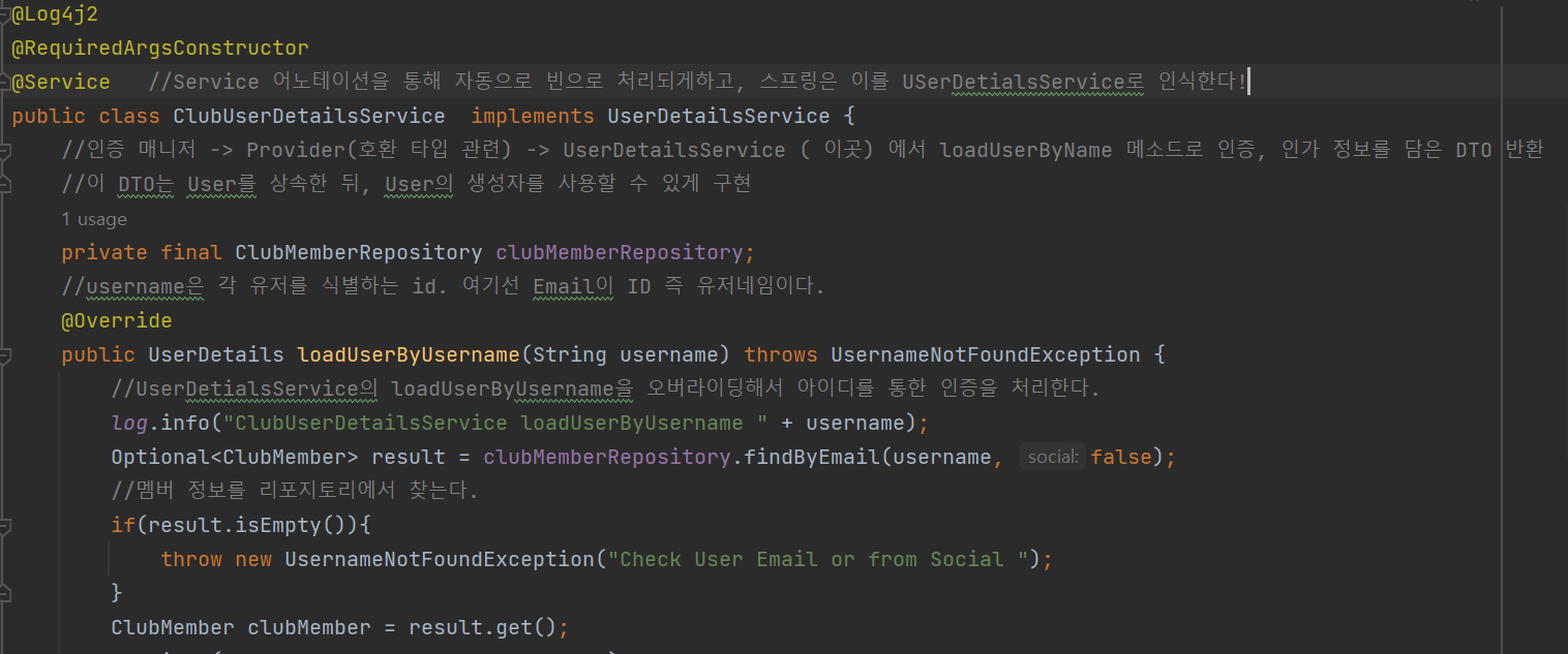 여기서 중요한 점은 @Service 어노테이션을 통해 ClubUserDetailsService라는 UserDetailsService 인터페이스의 구현 클래스를 빈으로 등록하는 것인데, 이렇게 해주면 자동으로 스프링 시큐리티는 UserDetailsService를 상속받은 ClubUserDetialsSerivce를 UserDetialsService로 인식하기에, username을 통해 회원 정보를 가지고 오는 절차를 오버라이딩하여 구현할 수 있다.