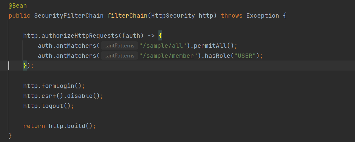 auth.antMatchers("/sample/member/").hasRole("USER") 이 부분이다.