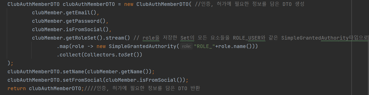 찾은 회원 정보(clubMember)를 통해 앞서 만들어둔 ClubAuthMemberDTO라는 인증/허가에 필요한 정보를 UserDetial 정보를 처리하기 위해 DTO를 생성한 뒤, 리턴해준다.