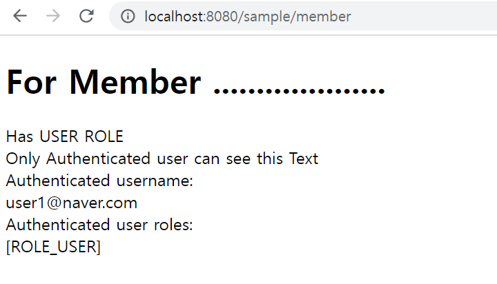 5) 만약 유저에게 "USER" 권한이 존재한다면, 요청한 url "/sample/member"에 대한 작업을 수행한다.