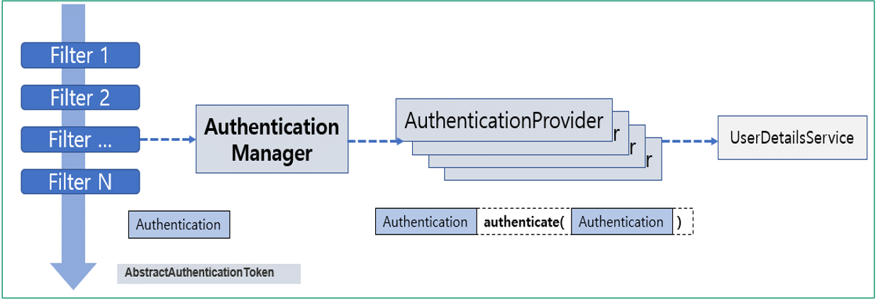 - 필터에서 인증 객체를 받아 Form 인증, RememberMe 인증, OAuth 인증 등, 인증 요청에 따라 그에 맞는 AuthenticationProvider를 찾아 실제 인증 역할을 위임한다.