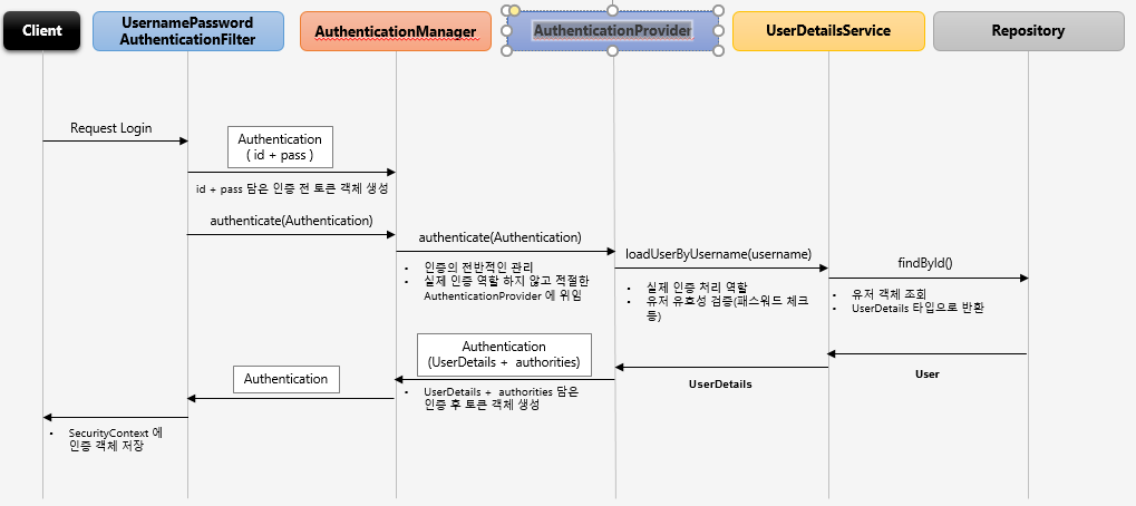 - ID검증, Password검증, 추가검증을 하고 인증에 성공하면 UserDetails 객체를 AuthenticationManager에 리턴한다.