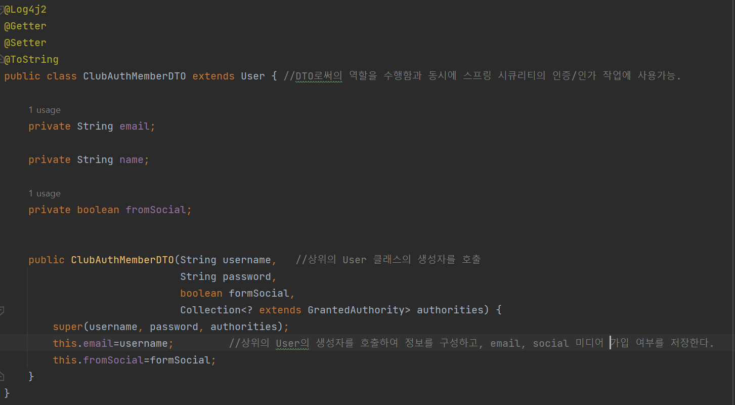 이후 DTO를 구성해주면 스프링 시큐리티에서 인증/인가 작업에서 사용하는 동시에 유저 정보에 대한 DTO로써 사용할 수 있다.