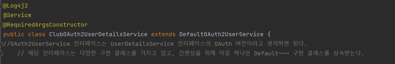 우선, 앞서 UserDetailsService를 상속받아 구현한 클래스와 마찬가지로, @Service 어노테이션을 붙여 스프링 빈에 자동 등록되게하면, 해당 클래스를 OAuth2UserService로 인식하고 사용하게 된다.