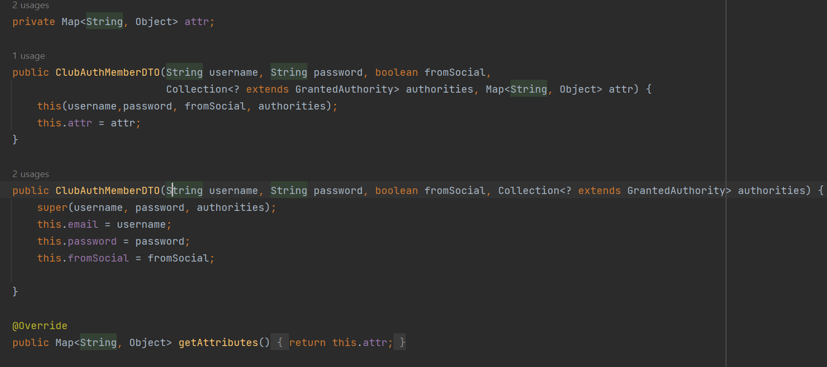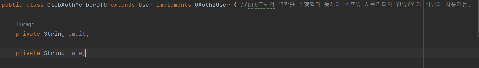 하지만 우리는 이제 OAuth2User 객체를 ClubAuthMemberDTO로 치환해야 되고, 위에서 나온 과정처럼 마법같은 타입캐스트가 발생하기 위해선, ClubAuthMemberDTO가 OAuth2User 객체를 상속받아야만 한다.