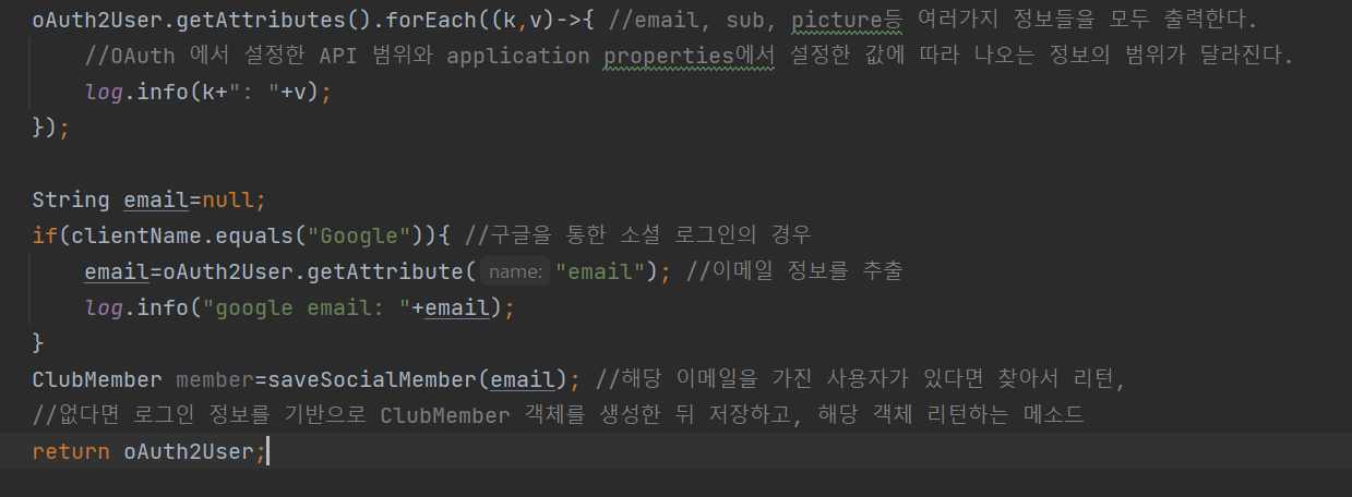 email 정보를 추출하고, saveSocialMember() 메소드에 넘겨준다.