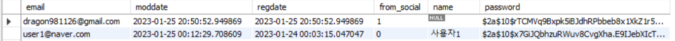 이제 다시 Google을 통해 로그인을 하면, 아래와 같이 데이터베이스 내에 소셜 로그인 사용자의 정보가 들어가는 것을 확인할 수 있다.