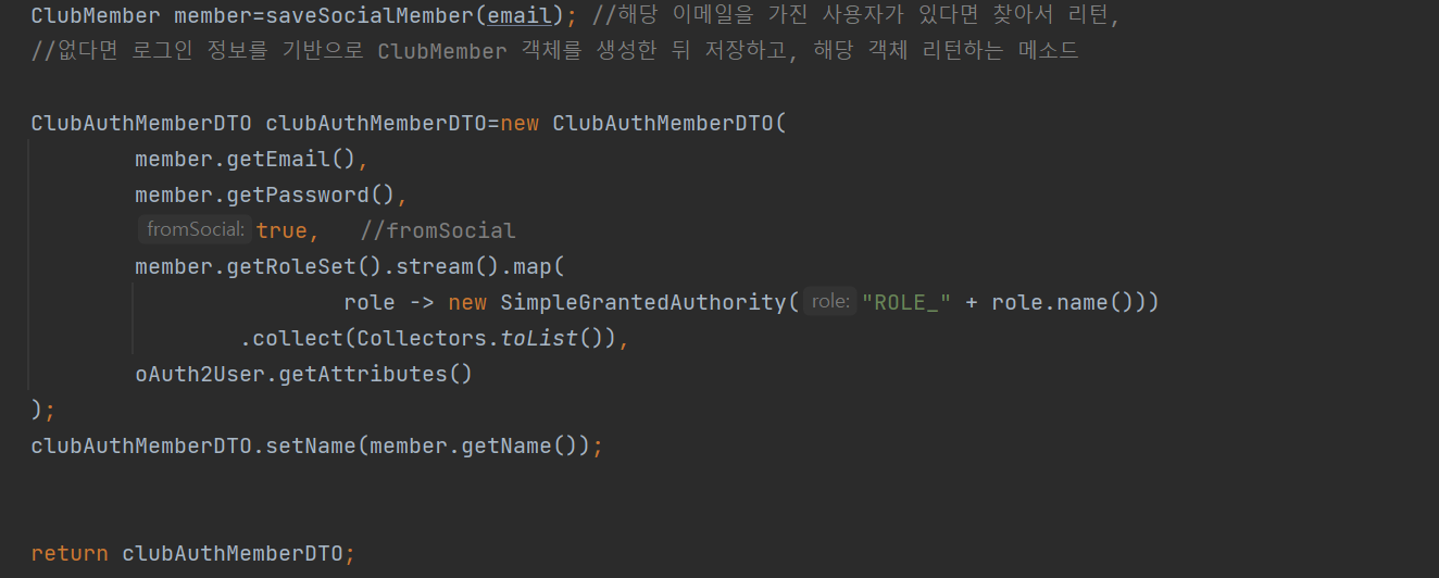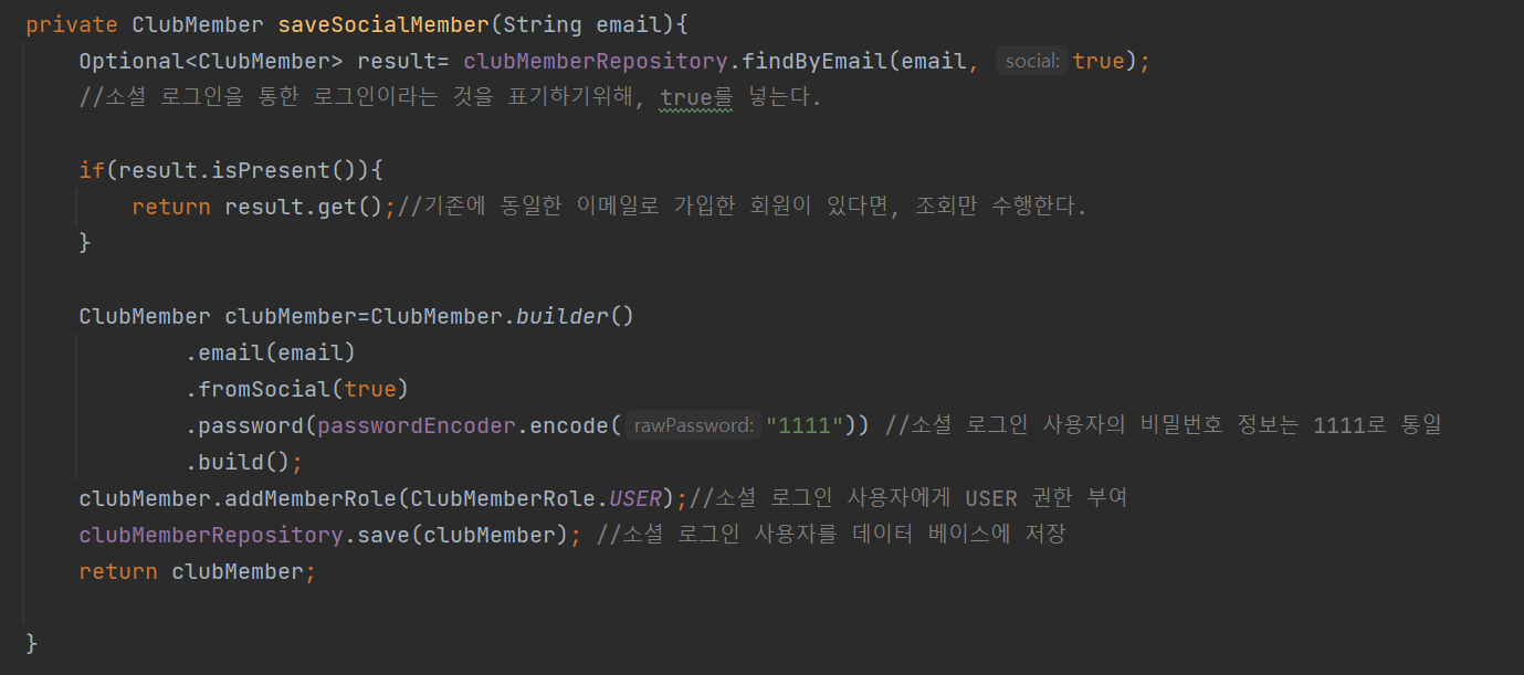아래는 받은 email 정보를 기반으로, 데이터베이스에 해당 유저가 존재하는지 찾고, 없다면 데이터베이스에 추가한 뒤 리턴해주는 saveSocialMember() 메소드의 구현이다.
