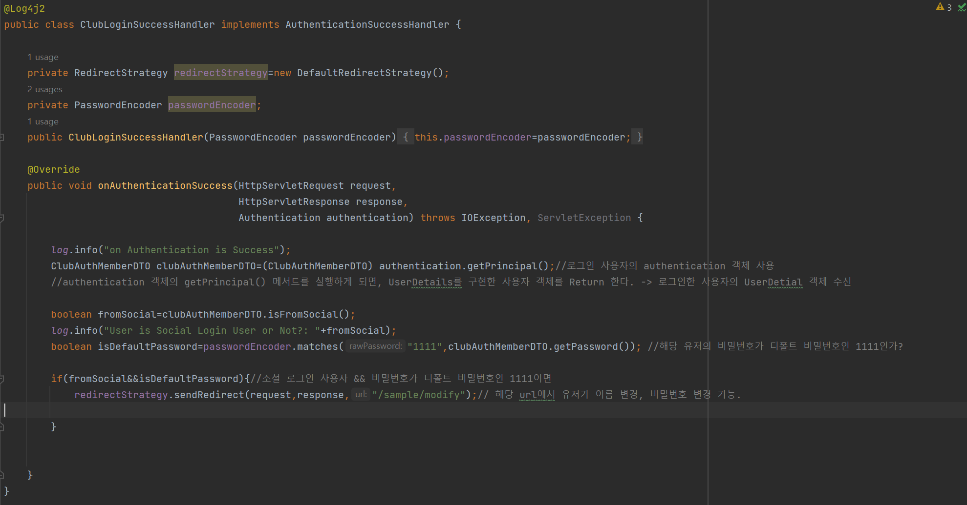 만약 소셜 로그인 이용자이고, 비밀번호가 디폴트인 "1111" 이라면 "/sample/modify" 로 리다이렉트하게 구현하였다.