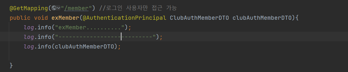ClubAuthMemberDTO라는 인가, 인증에 더불어 DTO의 역할까지 수행하는 DTO 객체 타입을 전달받아 사용하기에