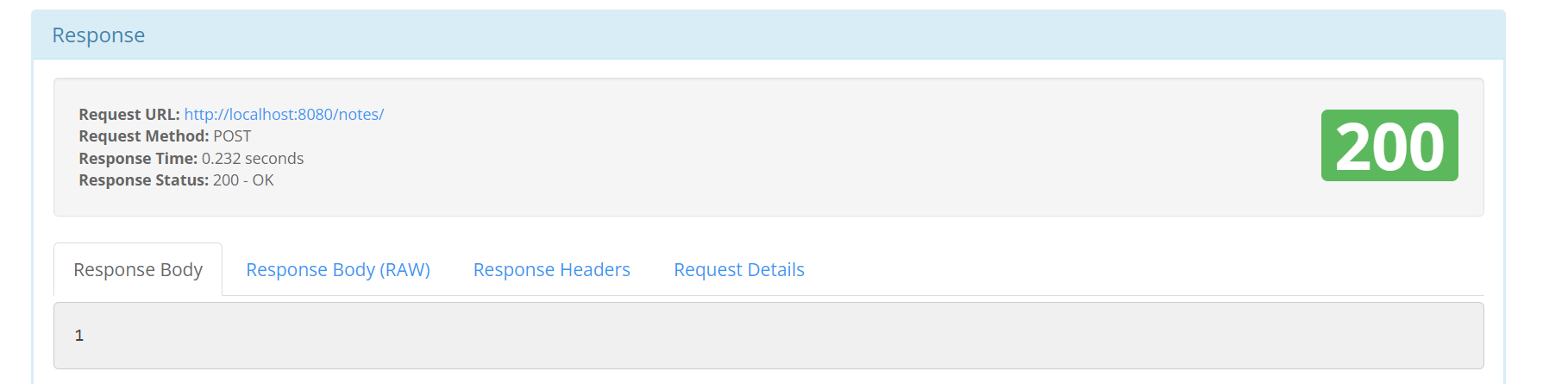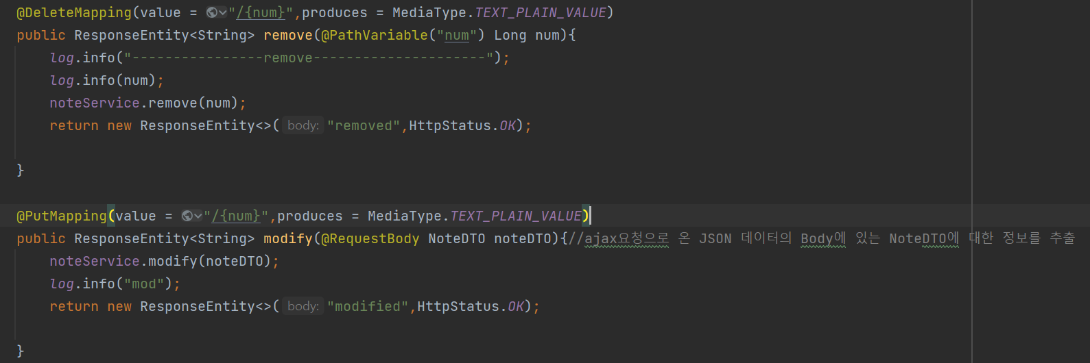 JSON 데이터를 수신하면, NoteDTO로 변환하여 작업을 처리하고, 처리완료된 note의 번호와 성공 메세지를 리턴한다.