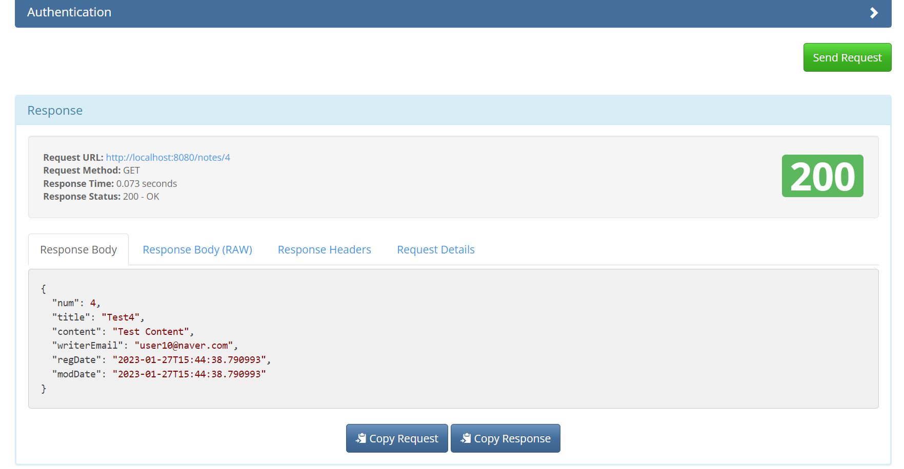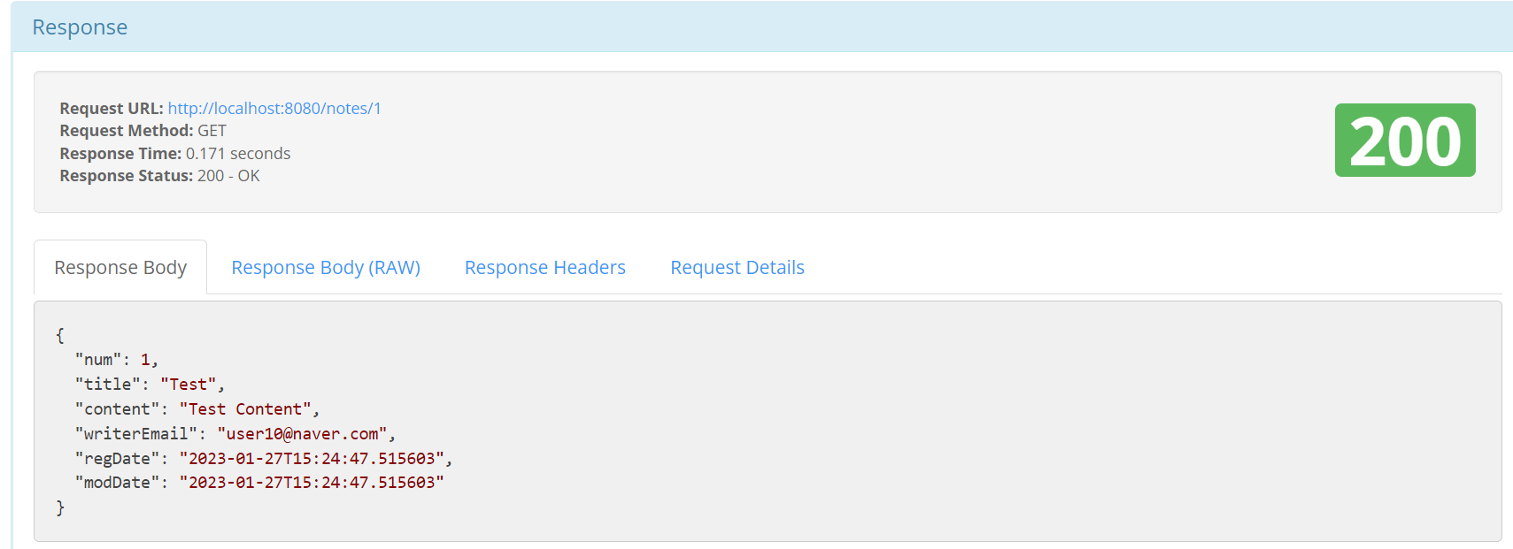 그럼 아래와 같이, 해당 num을 가진 NoteDTO 객체가 Reponse된다.