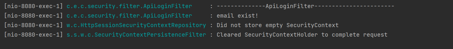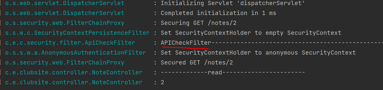 로그를 보면 알겠지만, 현재는 생성한 APICheckFilter라는 필터는 맨 마지막에 적용되었다.