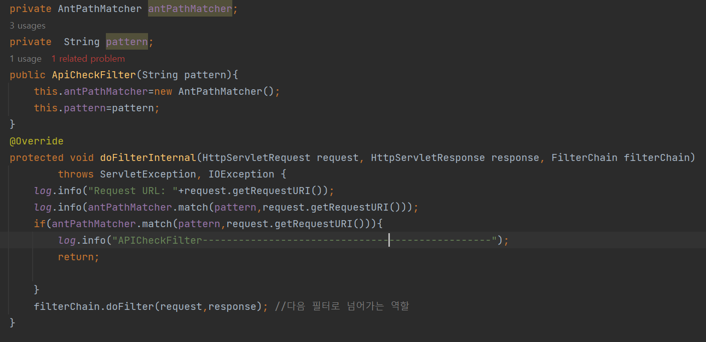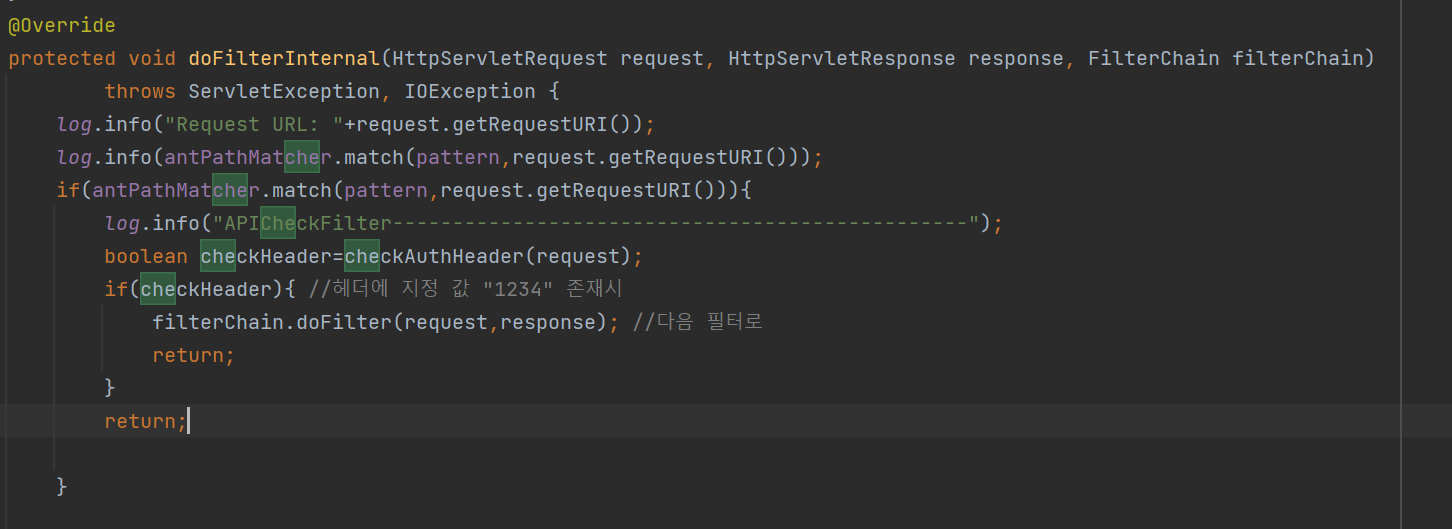 아래는 생성한 필터에 AntPathMatcher를 추가한 코드이다.