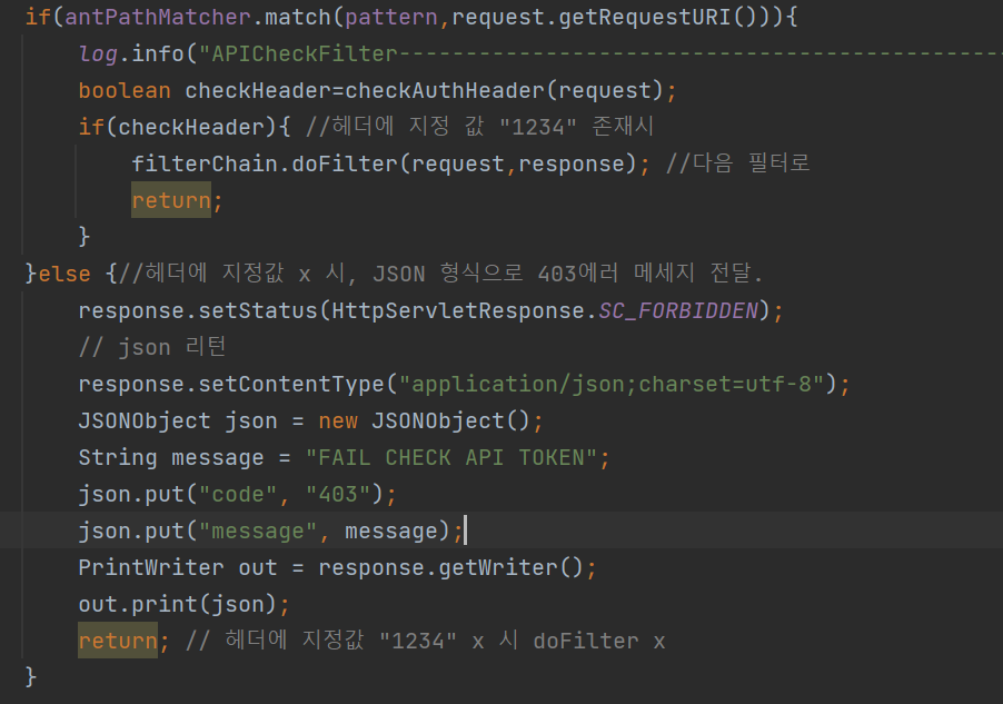 이후 해당 메소드에서 True 값이 나올때만 doFilter() 메소드를 통해 넘어가도록 구현해보자.