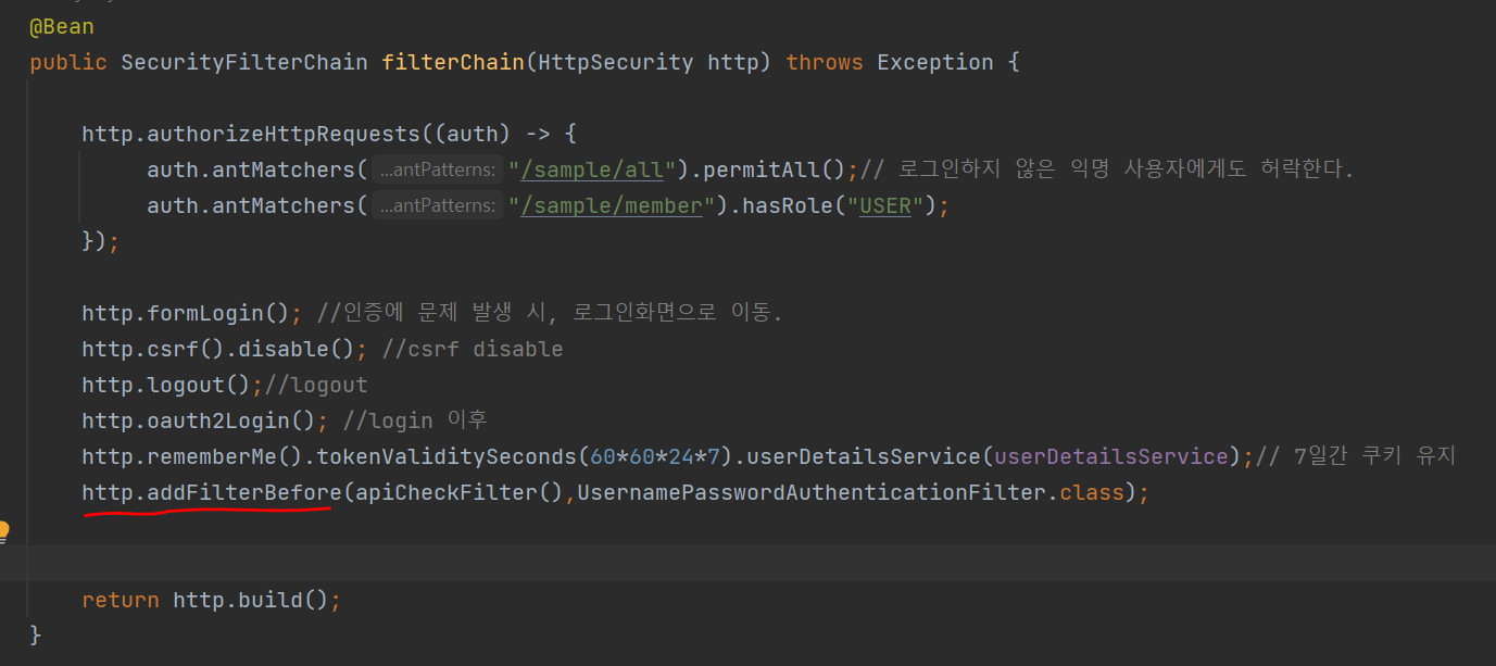 이제 생성한 필터를 SecurityConfig( @ Configuration 어노테이션으로 빈에 등록할 수 있게 만든 Config 클래스) 에 등록해보자.