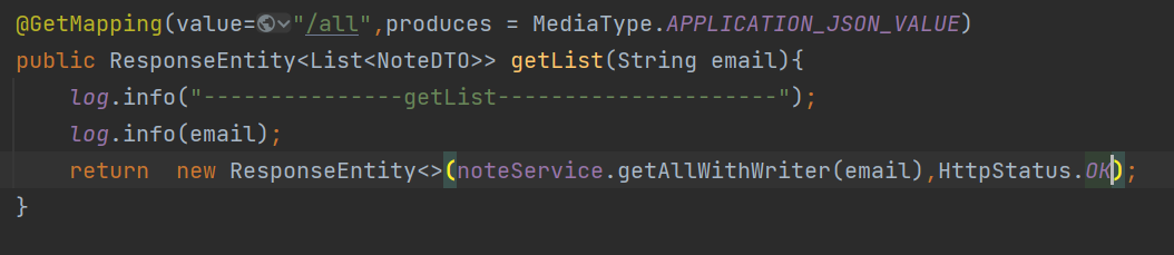 url에 "/all?email= 이메일" 을 더해 이메일 정보를 get 으로 보내면, getList 파라미터 email에 이메일 정보가 String 타입으로 들어가게 된다.