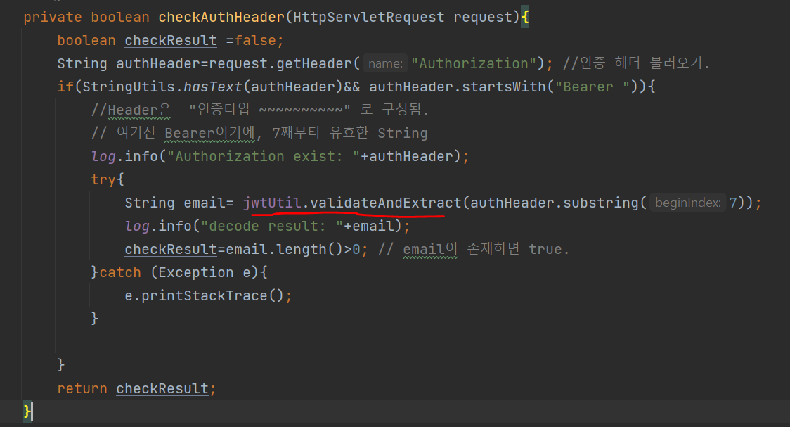 기존에 ApiCheckerFilter에서 "1234" 라는 임의의 인증 헤더 값을 JWTUtil의 validateAndExtract로 Decode하는 것으로 변경하자.