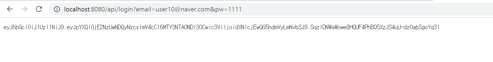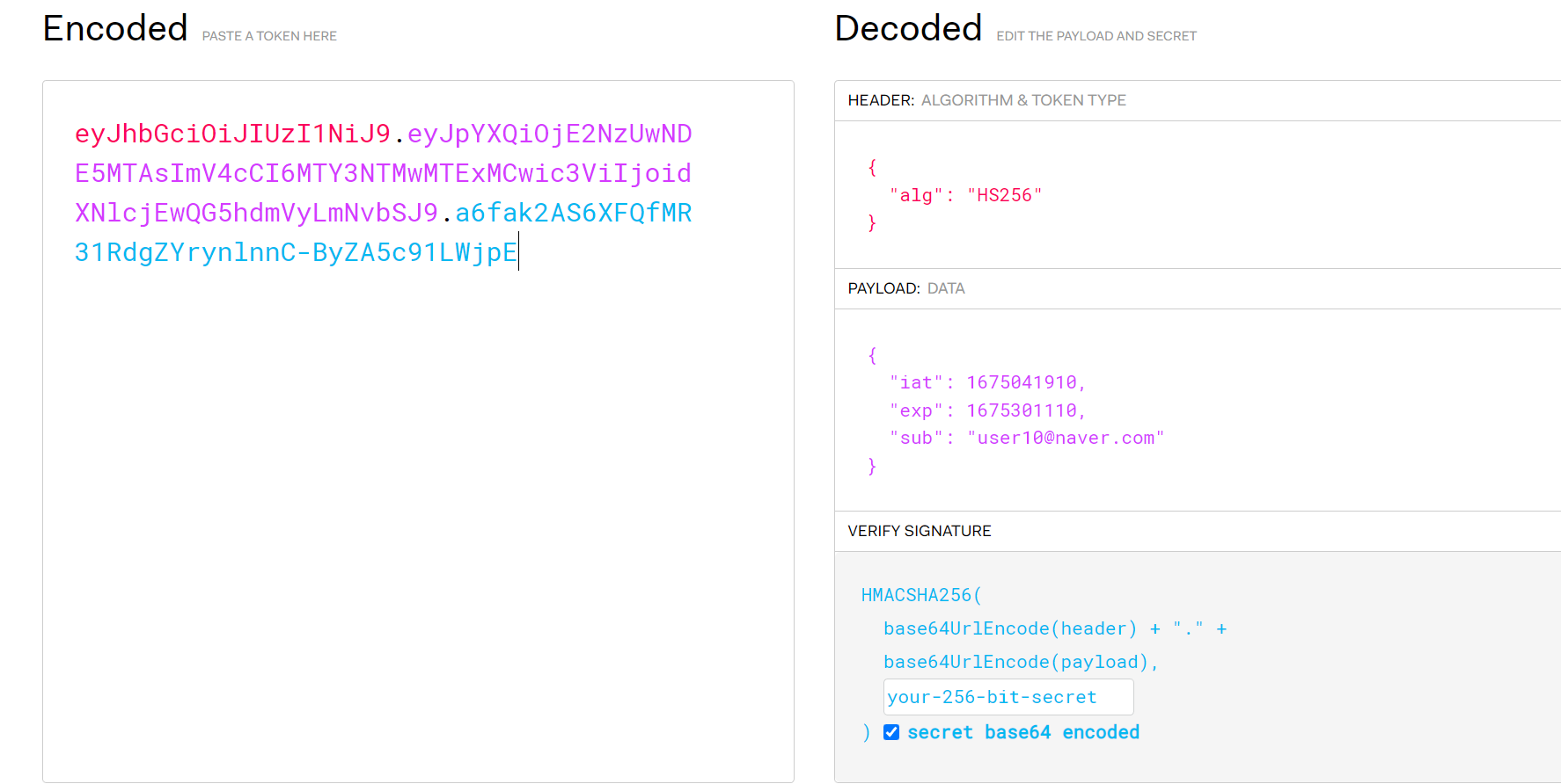 encode: eyJhbGciOiJIUzI1NiJ9.eyJpYXQiOjE2NzUwNDE5MTAsImV4cCI6MTY3NTMwMTExMCwic3ViIjoidXNlcjEwQG5hdmVyLmNvbSJ9.vTjlHWh0yI9DOHJ0giLpxdcJ9zVFM4ga90Go1g1eXFY