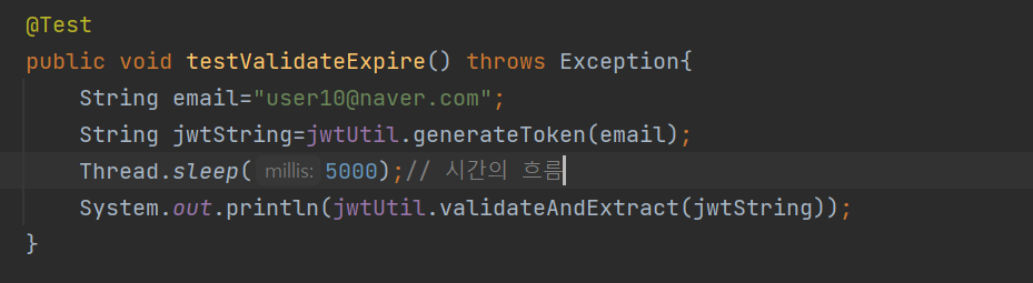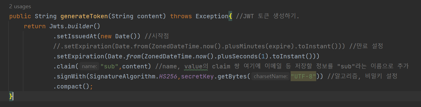 generateToken() 메소드의 파라미터로 email 값을 저장한 String을 넘겨주면, 만료기간, 해독에 쓰일 비밀키,