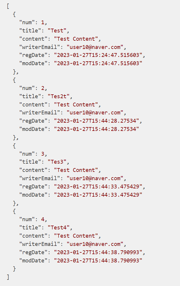 이번엔 email 정보를 get 방식으로 전달받아 해당 email정보르 사용자를 식별하여 해당 사용자가 작성한 모든 글을 조회해보자. 파라미터의 String email은 @RequestParam 어노테이션이 생략되어 있기에, url에 들어온 email 정보가 파라미터 email에 들어가게 됩니다.