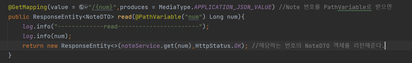 이번엔 url에 담긴 num 정보를 통해 매칭되는 NoteDTO 객체를 반환하는 컨트롤러를 구현해보자.