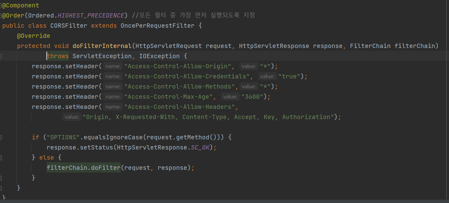 이를 위해 CORS 필터를 앞선 ApiCheckFilter, ApiLoginFilter 처럼 클래스를 생성하여 처리하자.