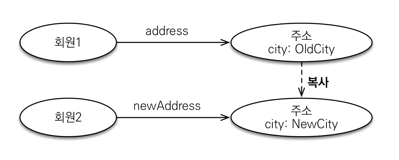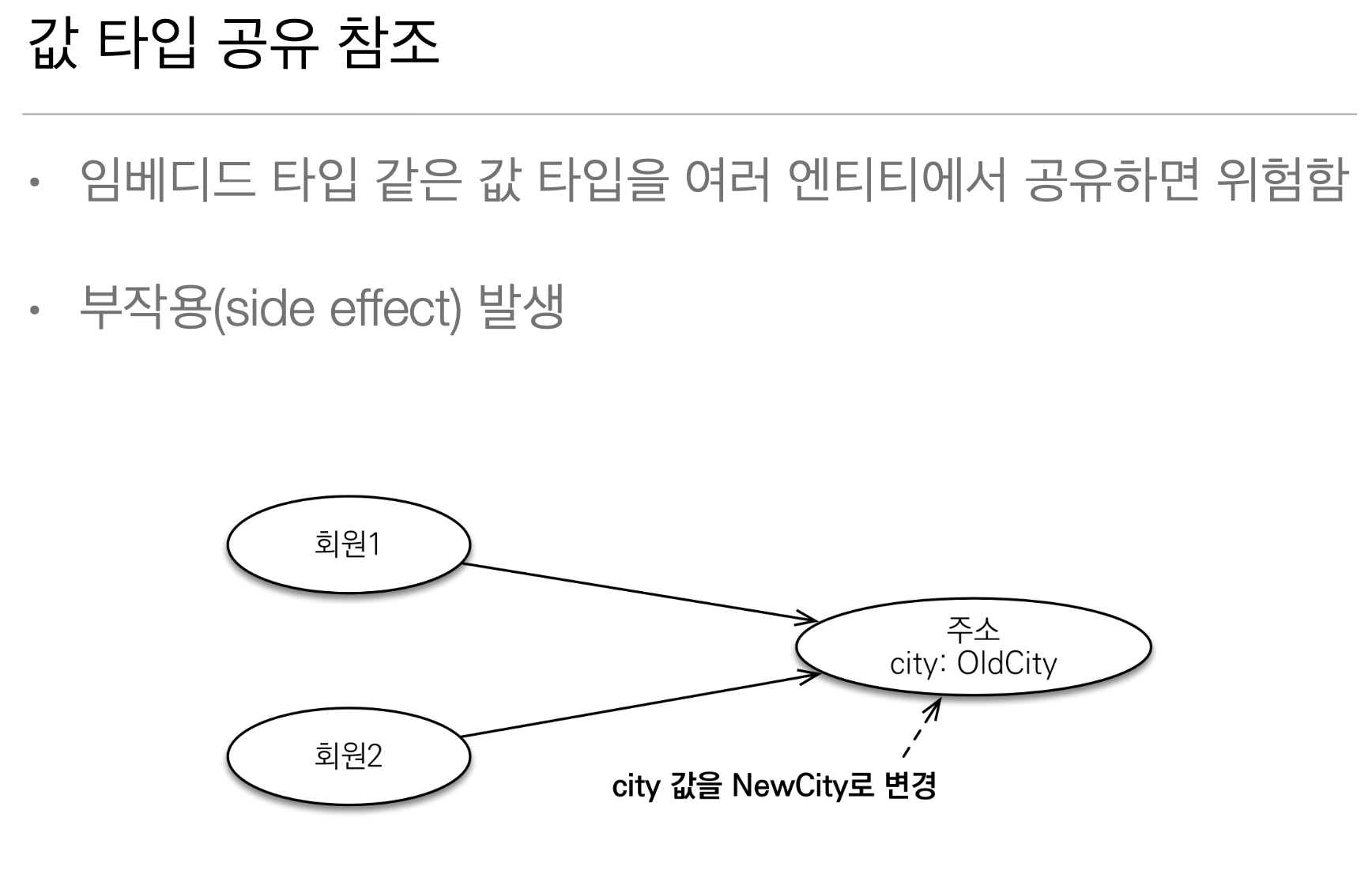 회원 1,2는 서로 다른 테이블에서 City라는 임베디드 타입을 가지고 있지만, 둘 중하나가 City라는 임베디드 타입을 바꾸면 나머지도 전부 바뀌게 된다.