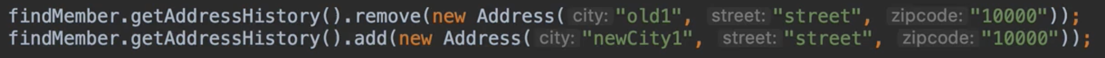 **주의: 바꿀값을 remove() 하고 add() 하는 것에서, 아마 값 타입 컬렉션 내에서 "바꿀 값인 old1~~~만 지우고 새롭게 넣는다" 라고 생각할 수 있지만, 실제론