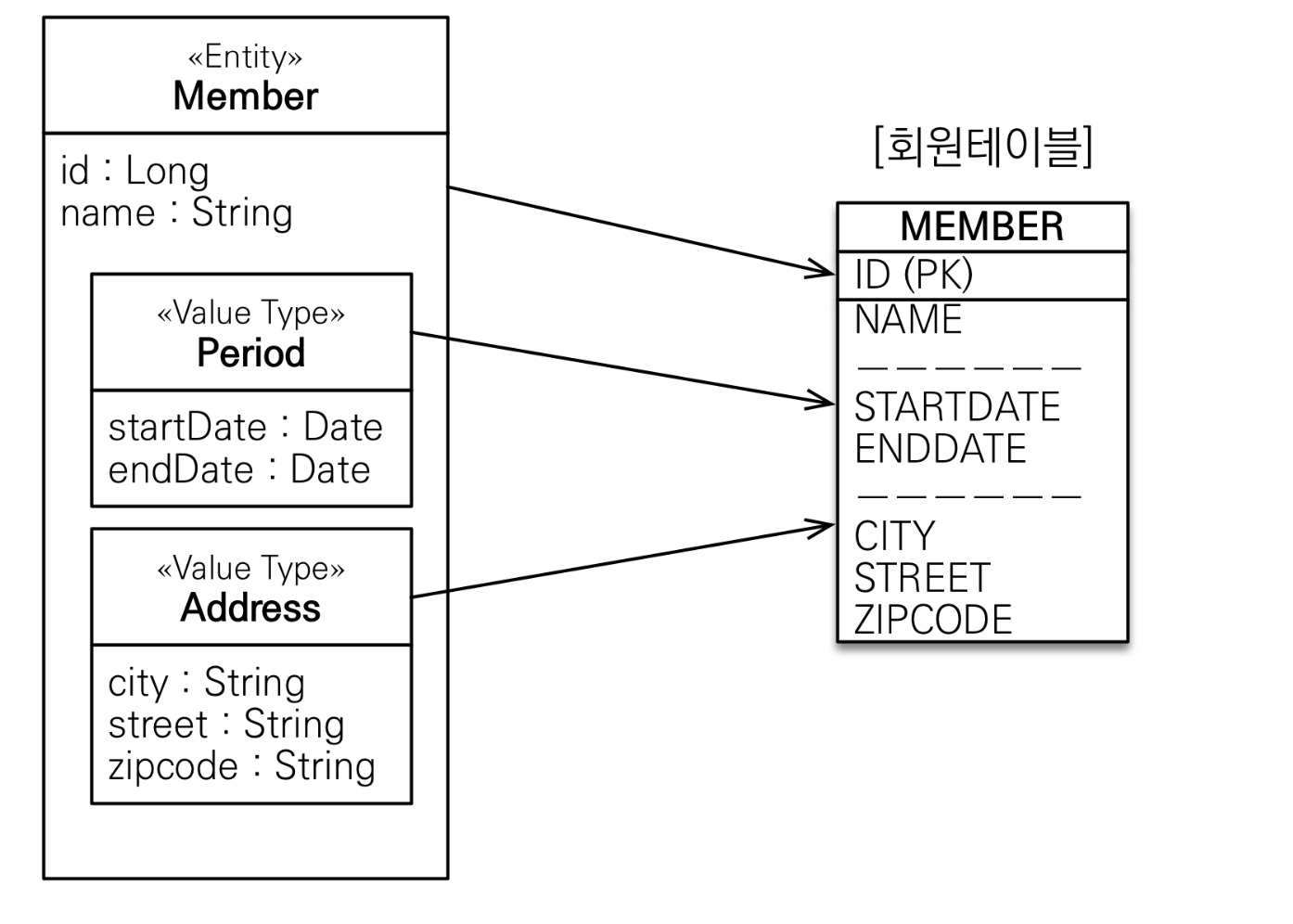 위의 예시에서는 Period, Address라는 임베디드 타입을 만들어서 묶어놓은 것.