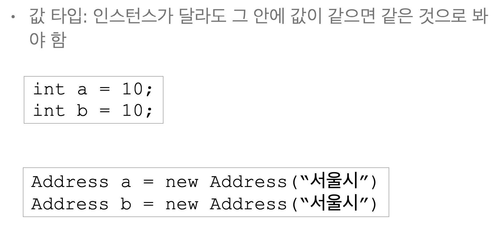 값 타입은 a.equals(b)를 사용해서 동등성 비교를 해야 함