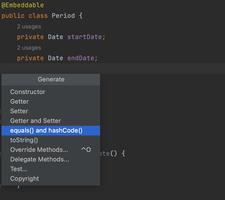 인텔리제이의 경우 해당하는 임베디드 타입 클래스로 가서 컨트롤+ shift 로 equals()를 선택하고 자동 생성 가능.