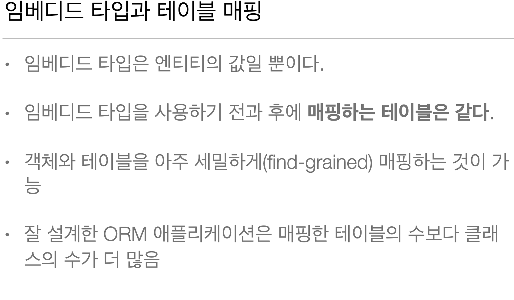 임베디드 타입(embedded type, 복합 값 타입): 좌표값 등을 묶어서 값으로 쓰고 싶을 때, x,y좌표를 클래스로 묶어 값처럼 사용