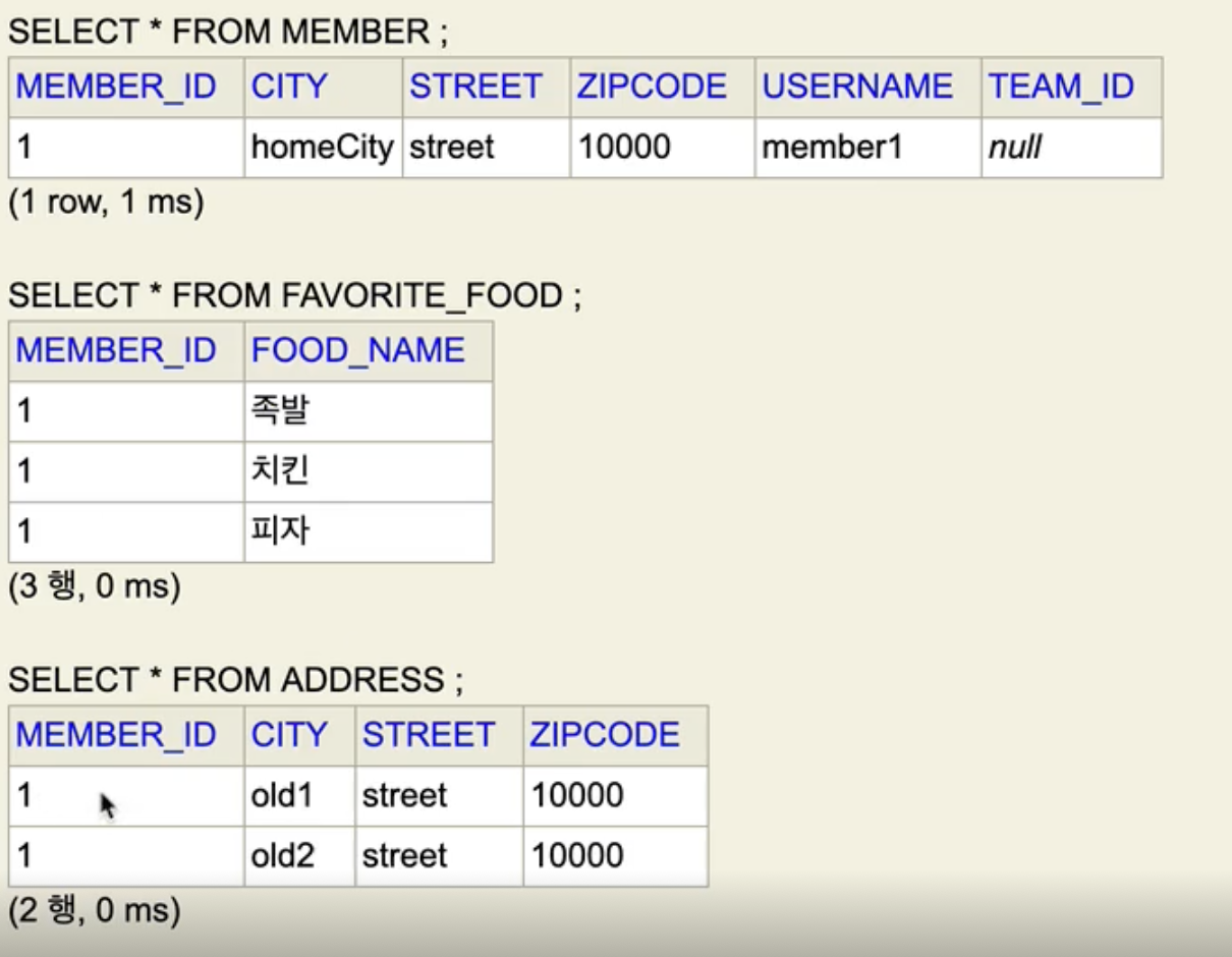 위의 어노테이션을 통해 Favorite_food 라는 테이블이 생성해 String 타입 컬렉션을 관리하고, ADDRESS 라는 테이블이 생성되어