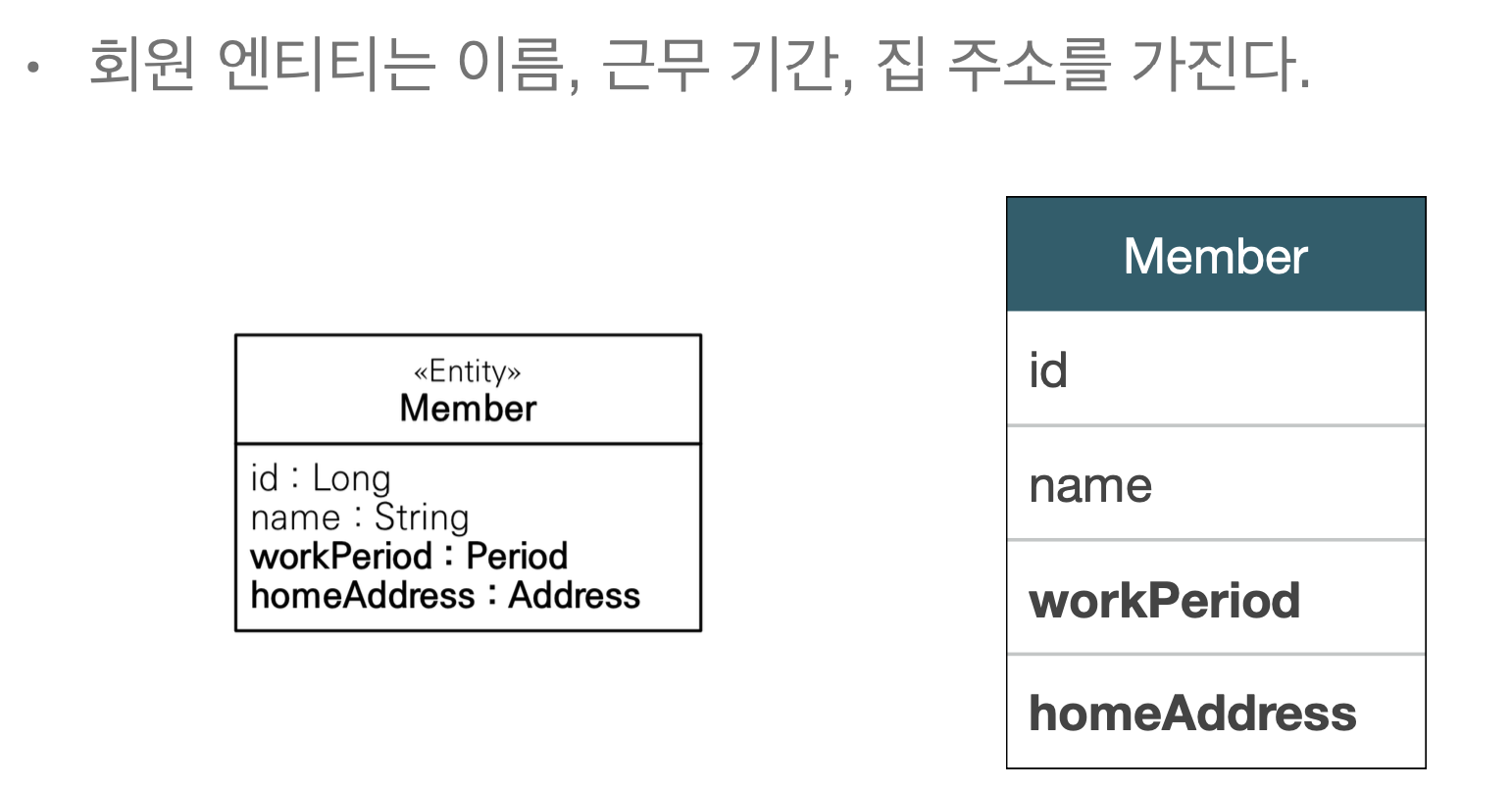 - 주로 기본 값 타입을 모아서 만들어서 복합 값 타입이라고도 함 int, String과 같은 값 타입