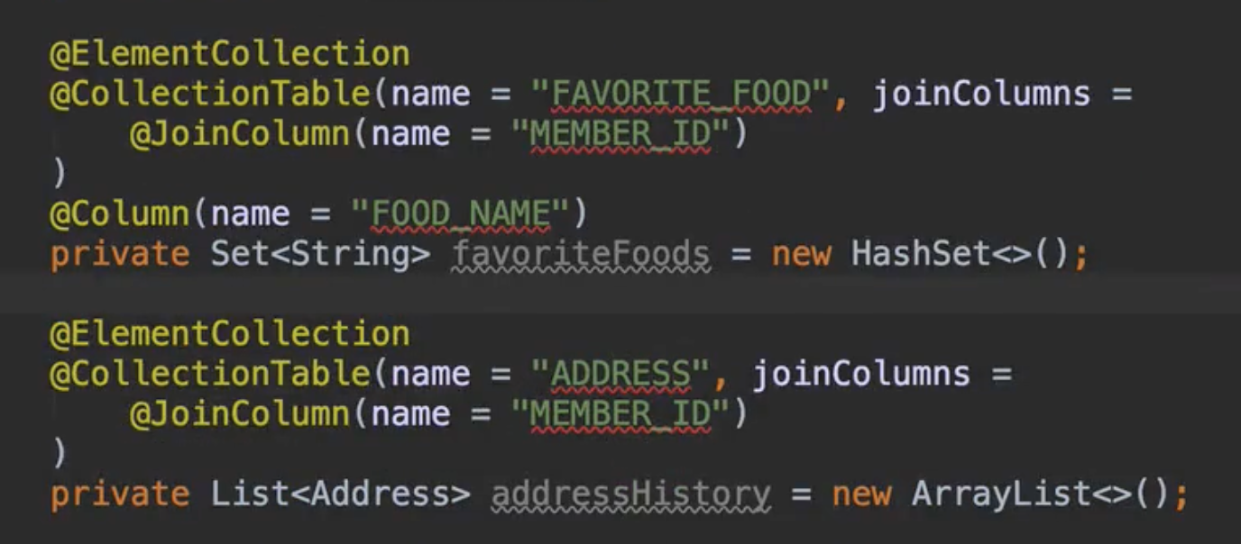 - 값 타입을 하나 이상 저장할 때 사용 ( ex: 주문 음식 리스트: "Food"라는 임베디드 타입 여러개를 List에 담아서 저장하는 경우)