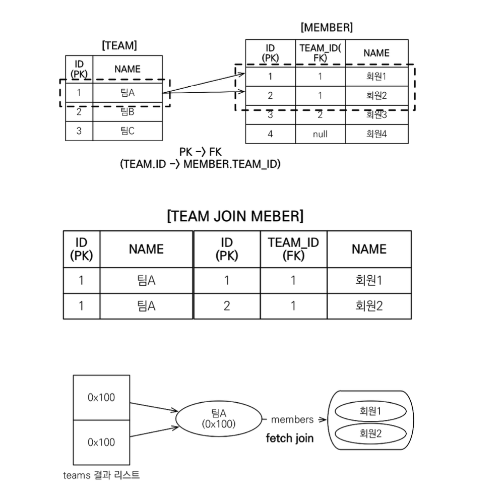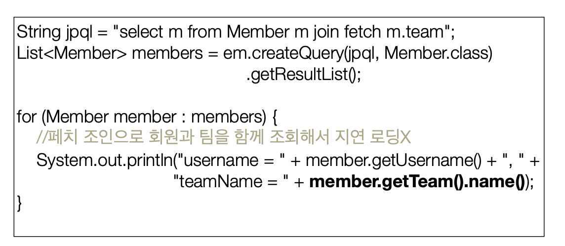 String query = "select m from Member m join fetch m.team" //한번에 team도 같이 가져온다.