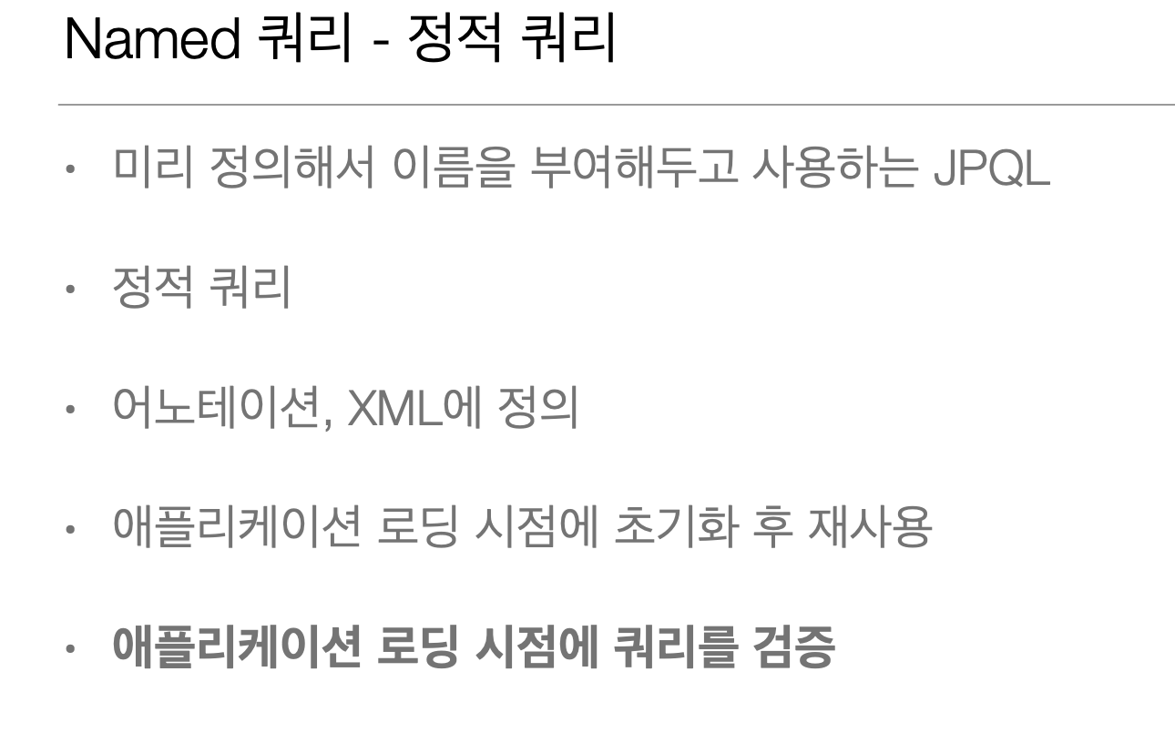 "selectfdsfwaegg m from Member m" <- 쿼리는 String으로 들어가고, 애플리 케이션 로딩 시점이 아닐 때 이것 처럼 쿼리 문법 문제는 컴파일 타임에 잡아낼 수 없다. -> 애플리케이션 로딩 시점에 쿼리 검증시 잡아낼 수 있다.