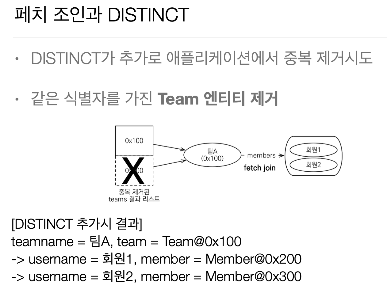 JPA입장에선 (객체 관점) 중복된 사항을 알 수 없다. -> distinct로 제거해야한다.