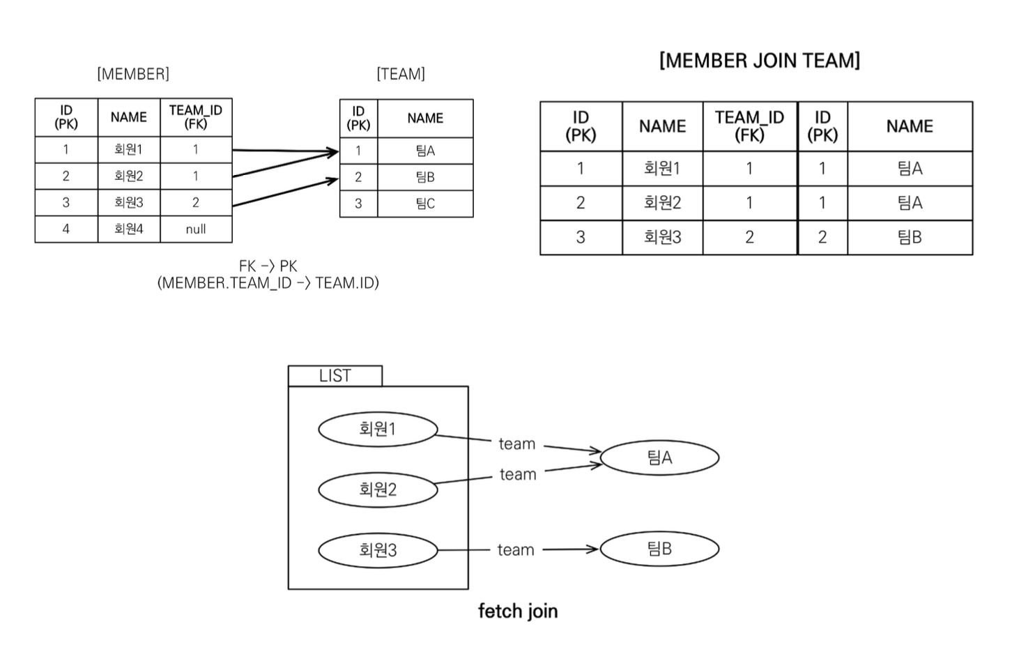 fetch join: jpql에서 성능 최적화를 위해 제공하는 기능. 연관된 엔티티나 컬레션을 SQL 한번에 함께 조회 가능.