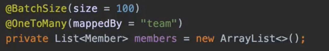 lazy 로딩 할 때, 한번에 100개씩 넘겨주게하는 설정. -> Lazy로 한번 끌어올 때마다 100개씩 끌어온다. 이를 통해 fetch join을 사용하지 않고, 어느정도 문제가 완화된다.