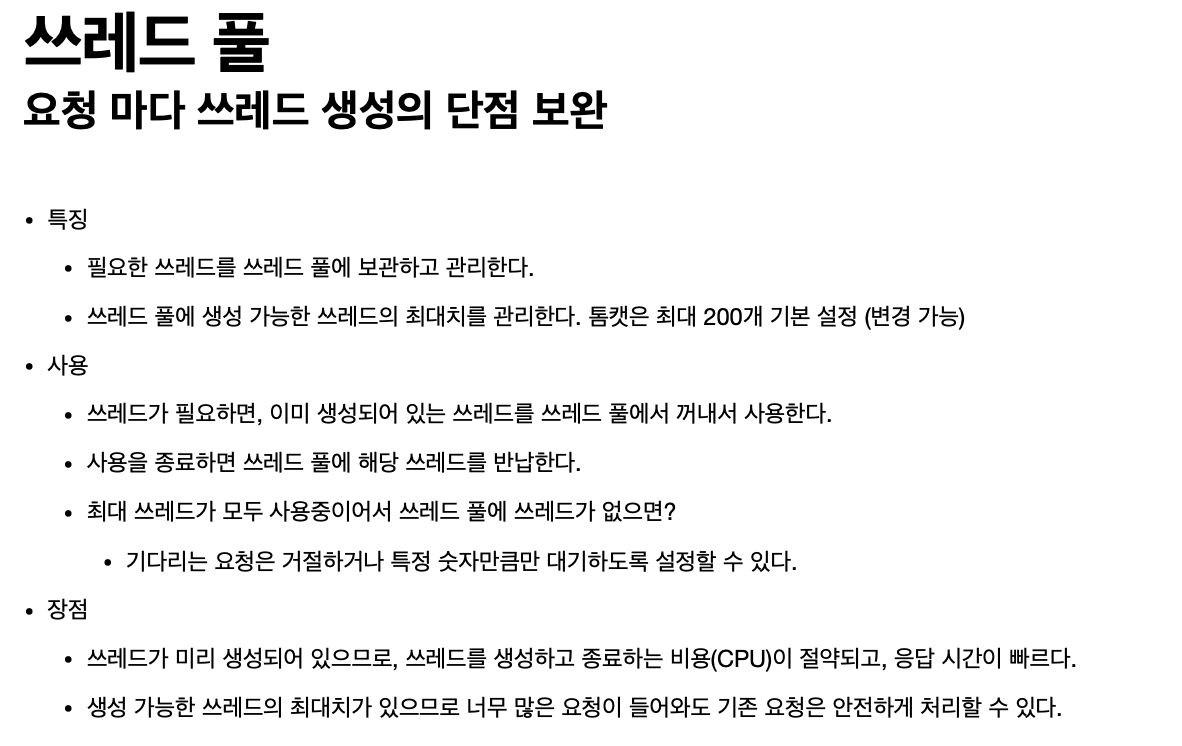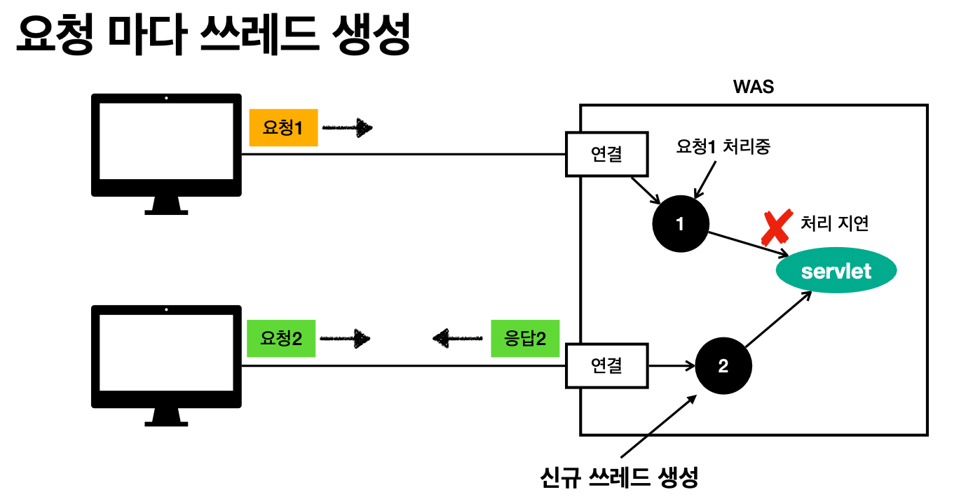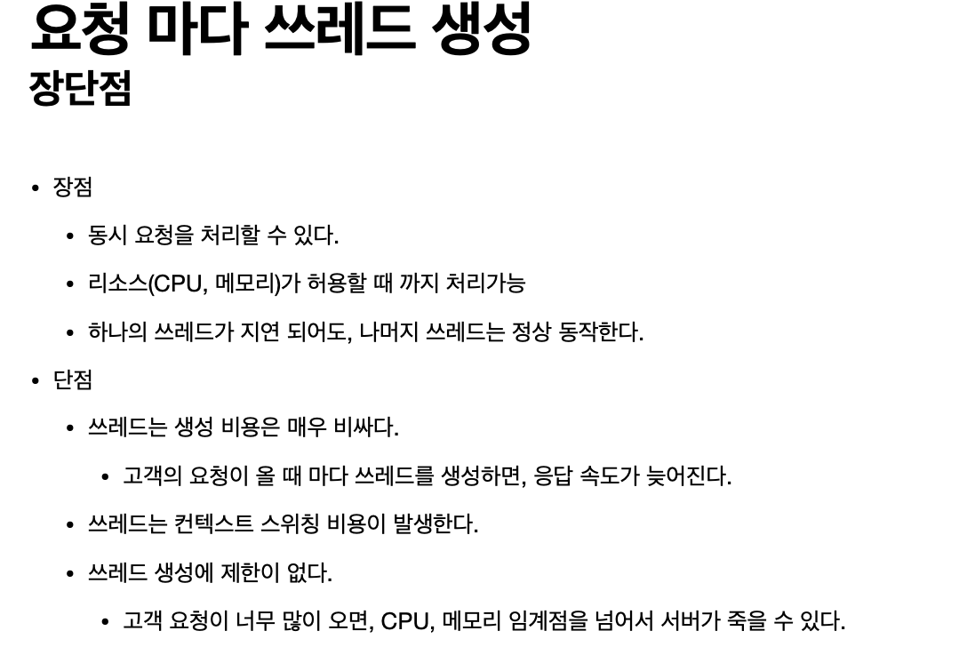 또한 너무 많은 요청이 밀려있다면, 쓰레드가 무한히 생성되어 계속해서 CPU에 들어오려한다(리소스를 너무 차지함). -> 서버 다운으로 이어진다.