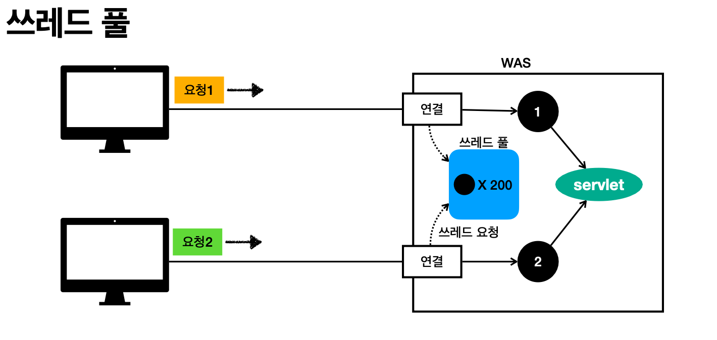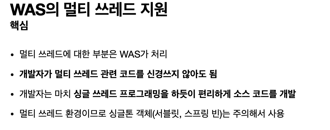 동시 요청을 위한 멀티 쓰레드 처리 지원 : WAS의 특징. 개발자가 멀티 스레드 관련을 실경쓰지 않아도 WAS가 알아서 처리해준다.
