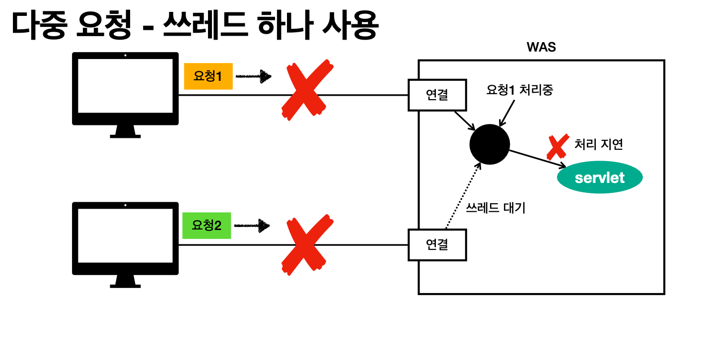 단일 쓰레드에서 만약 요청이 지연되면, 다른 요청이 스레드를 받기 위해 대기하고, 만약 계속해서 지연된다면 둘다 타임 아웃으로 반려된다.