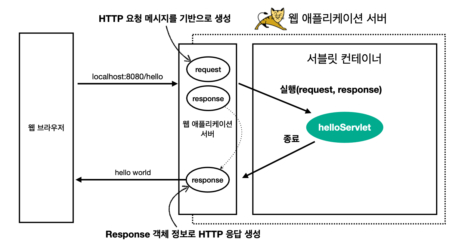was에서 받은 request 요청 메세지를 기반으로 새롭게 request, response 객체를 생성하고 서블릿 객체 (helloServlet) 에 파라미터로 전달.