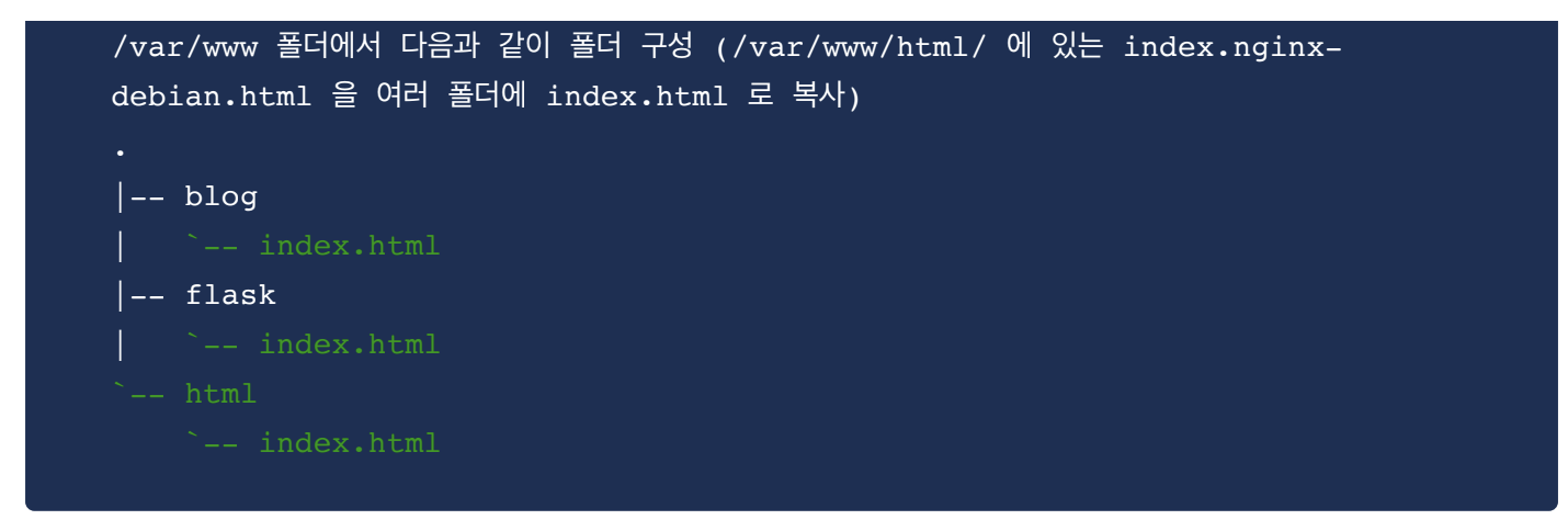 이제 /var/www/html/blog/ , /var/www/html/flask/ 경로에 index.nginx-debian.html 을 만들어서 올바르게 동작하나 확인해보자.